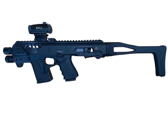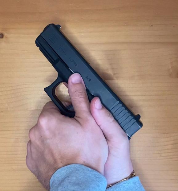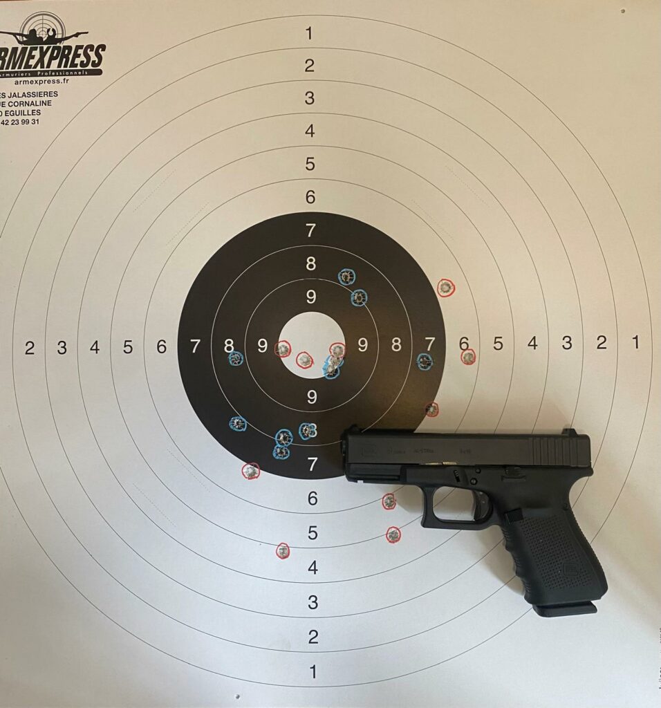 Note : Personnellement, c’est une bonne arme pour débuter le tir : facile à prendre en main mais exigeante à maîtriser. Elle offre de solides bases pour progresser. Le GLOCK peut être très précis — de nombreuses vidéos le démontrent — et présente un excellent rapport qualité/prix, à condition d’aimer son ergonomie et son toucher. Il est également possible d’apporter de nombreuses modifications pour améliorer le confort de tir. On peut aussi l’équiper d’une crosse de type RONI ou autre pour obtenir un petit PCC (voir ci-dessous).